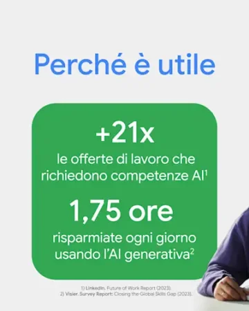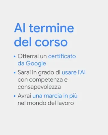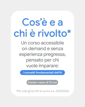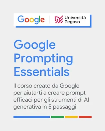Grazie alla collaborazione tra Pegaso e Google puoi accedere senza costi ai percorsi formativi ufficiali di Google sull’Intelligenza Artificiale, pensati per prepararti alle professioni del futuro